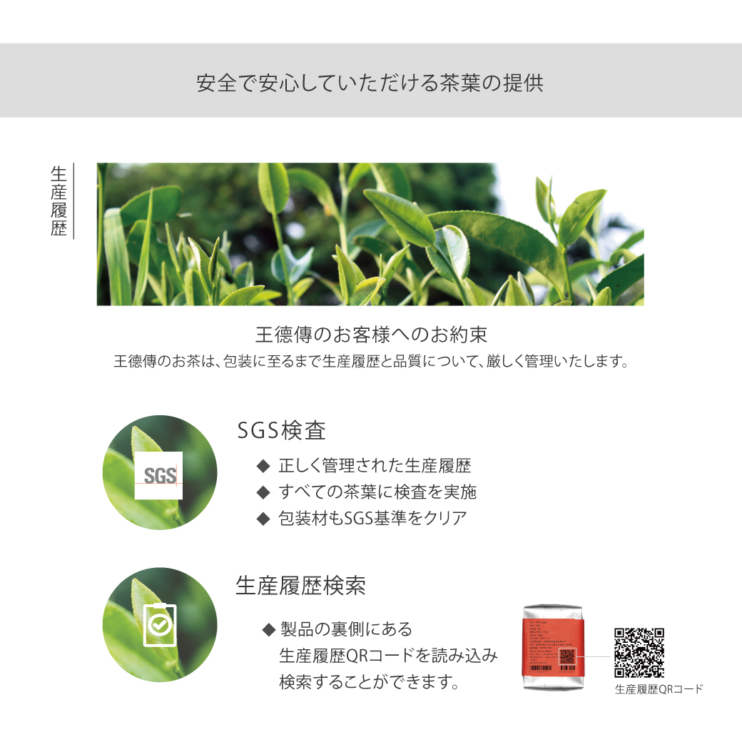 商品特徴 台湾高山産地厳選 海抜千メートル超の高地はひんやりしっとりとし、昼夜に激しい温度差があります。茶葉は厳しい気候にじっと耐え、甘みと味わいをたくわえます。製茶の技と絶妙な焙煎で、丁寧に摘み取った茶葉からうまみをひきだし、山々が持つ「気」を表現しています。 王德傳は20-25%の軽発酵の製茶の技で甘やかさの中に花の香りを際立たせ、さらに軽めの焙煎でそれぞれの山が持つ「気」を引き出します。 大地と人を尊ぶ わたしたちは、お茶のエキスパートとして、茶葉についての豊かな知識、鋭敏な味覚を常に備え、一年の大半を台湾や中国のさまざまな産地で過ごします。最高級の茶葉を求めつつ、産地それぞれの土壌や気候、雨、標高、生産者の栽培の様子を丁寧に観察し、理解を深め、お茶の味わいにそれらがどのような影響を与えるか正確に把握できるよう努めています。自然を慈しみ、大地を敬う德傳のお茶はすべてSGS認証を取得しておりますので、安心してお召し上がりいただけます。